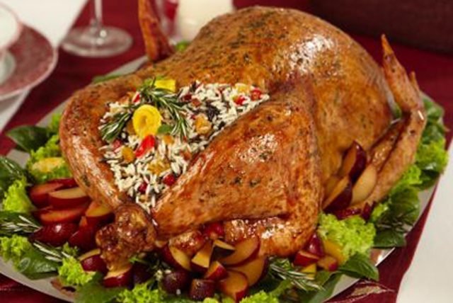 Pavo Relleno 25 a 30 Porciones o Porción 220 Grs, Arroz con verdura, carne pavo en vino.